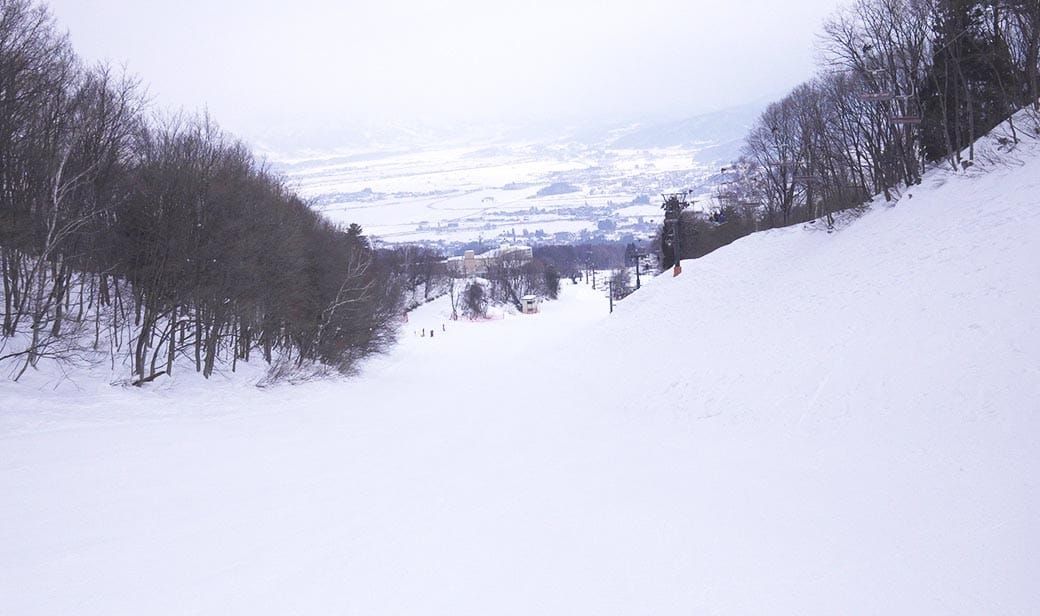 スノーリゾート ロマンスの神様のメインコース。リフト降り場からの眺めは記念撮影におすすめであり、木島平村の景色に飛び込むような入口があり、コース上部は中上級者が滑るのに気持ち良く、すこしずつ斜度は緩くなりコース下部は初級者の練習に向いている。