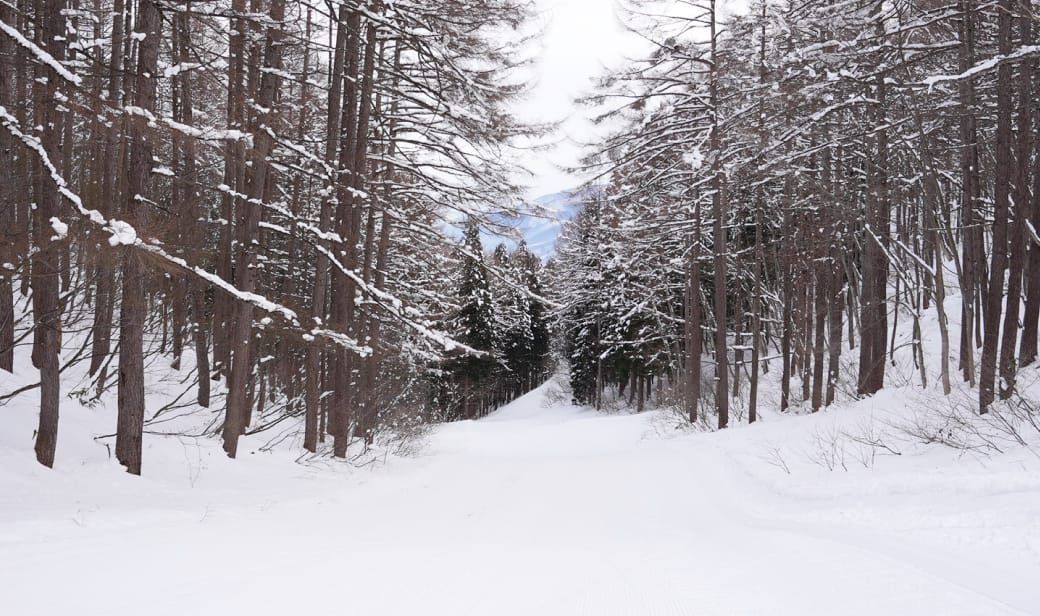 スノーリゾート ロマンスの神様唯一の林間コース。スカイコースから徒歩で移動が必要で、普段は見ないゲレンデの様子が歩くことによって感じられます。静かな山の中に突然迷い込んだように感じられる面白いコース。